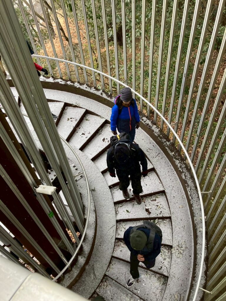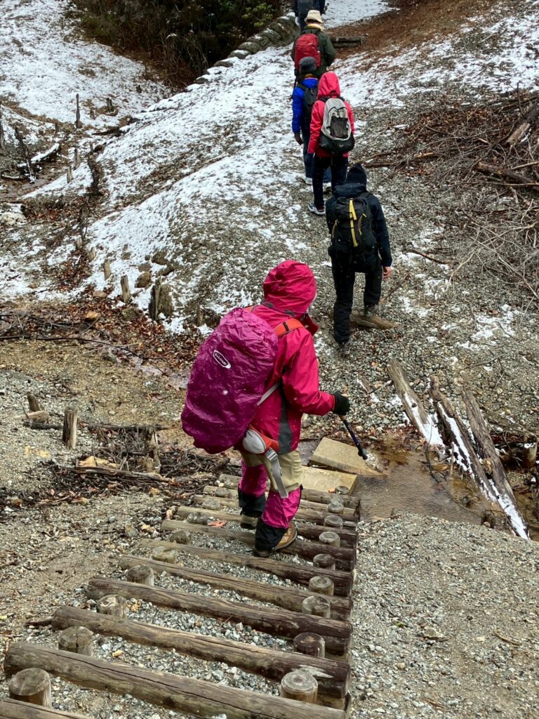 2026 1月25日(日)寒風吹きすさぶ中 バス停白金二丁目バス停をスタート 。雪も本降りになるが、負荷が少ないからか?皆の会話や笑い声が頻発する様になりました。ルート途中の「村上新田」近隣は雑木林に囲まれた雰囲気が印象的で、是非同地を再放送したいと思う様な楽しい例会となりました。一旦止んだ降雪が昼食時(ふれあい公園)に激しくなった為、同地からバス停に乗車、川西能勢口駅に向かいました