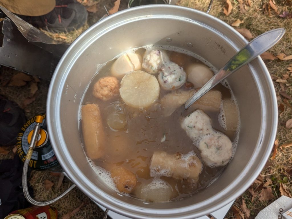 に陣取りザックの中身を取り出し店開き。豚汁、おでん、